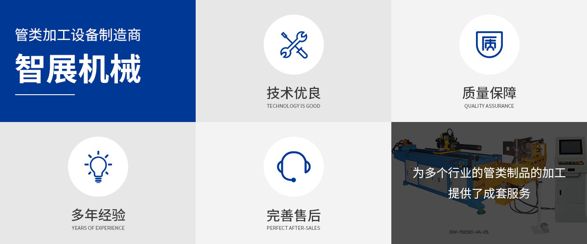 智展机械具备雄厚的设计研发能力,先后研制开发了CNC数控弯管机,CNC数控管端成型机,CNC数控金属圆锯机,单头/双头倒角机, CNC数控磨齿机等自动化管材加工机械及生产线。为航空航天、重工工程机械、核能核电、风能热电、造船游艇、汽车零部件、机动车车架、空 调制冷、体育健身器材、钢管家具、旅游休闲用品、水暖卫浴、装饰用材等行业的金属管类制品的加工提供了成套自动化设备。公司可根据客户需求设计,制造无人自动化机型以及各种非标机械设备。